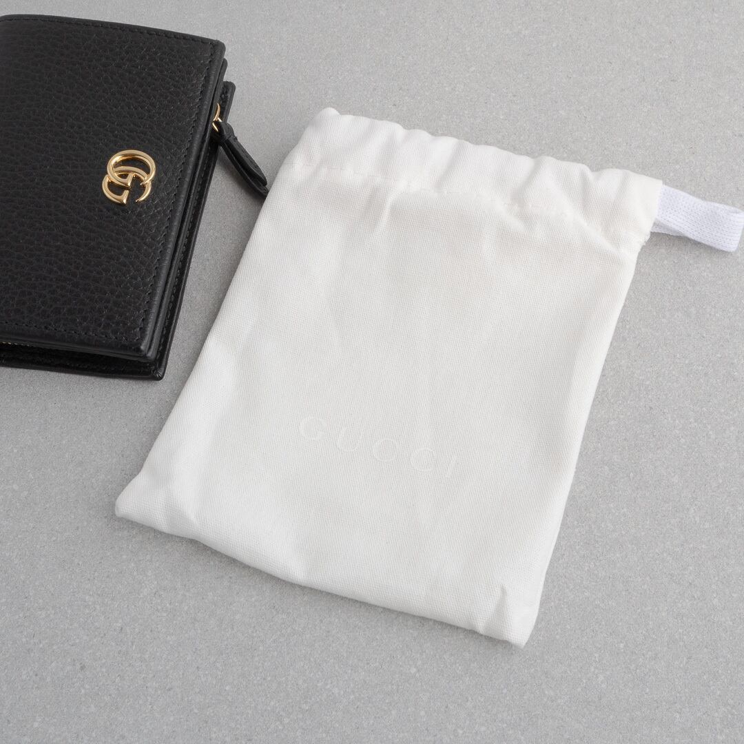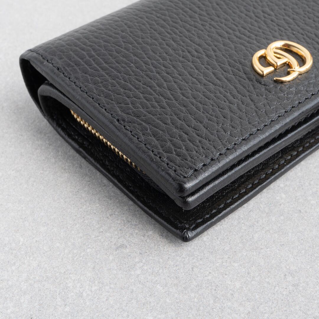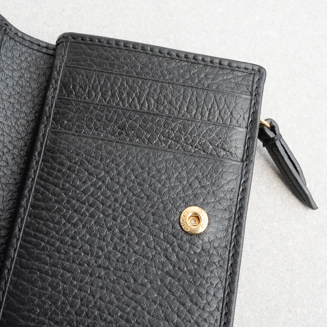 ブラックの上質なレザーにゴールドのダブルGが映える、モダンかつクラシックなデザイン。小銭入れは仕切り付きの2コンパートメント仕様で、マチもしっかりあるためたっぷり収納可能。コンパクトなサイズ感ながらカードは6枚収納可能で、デザイン性と実用性を兼ね備えたアイテムです。