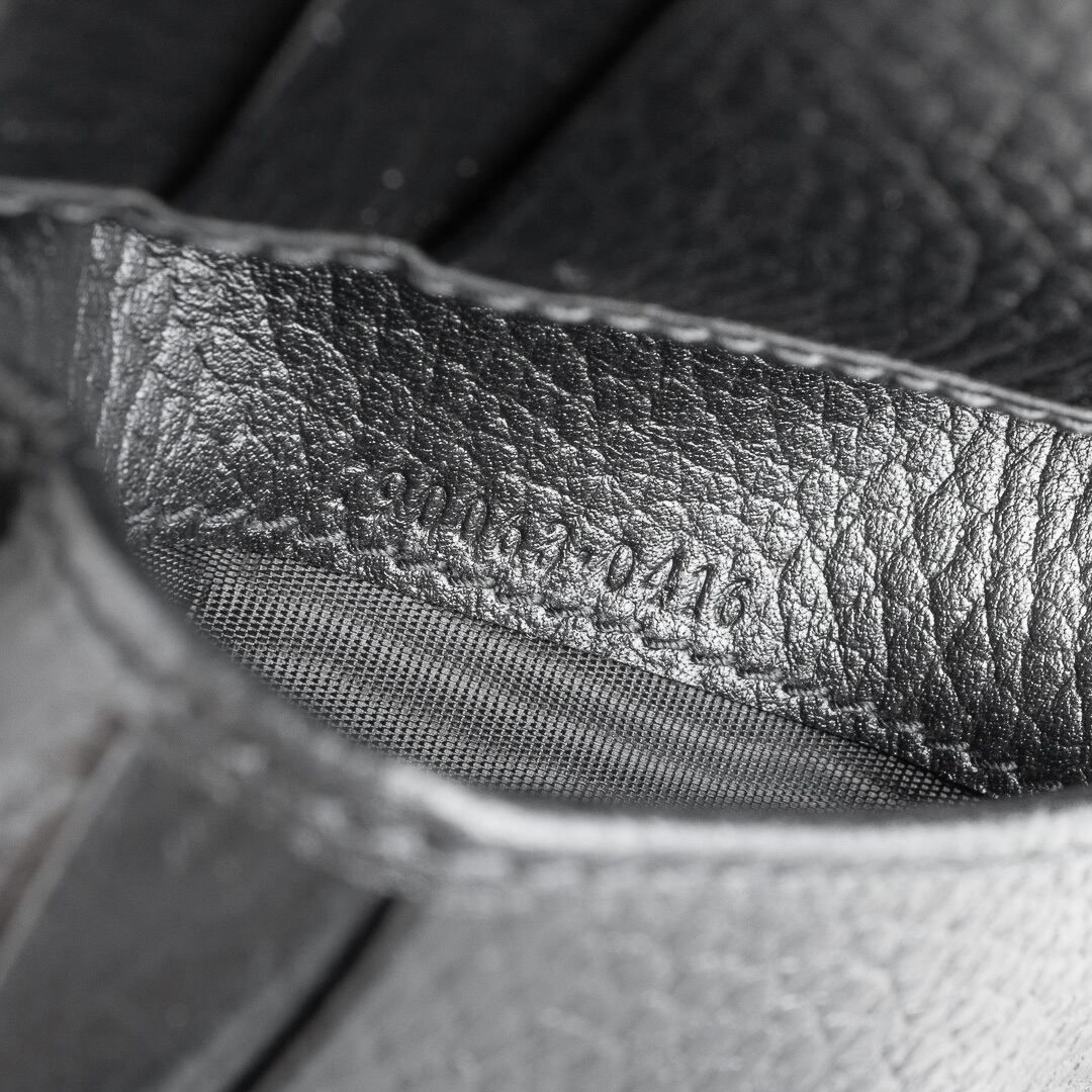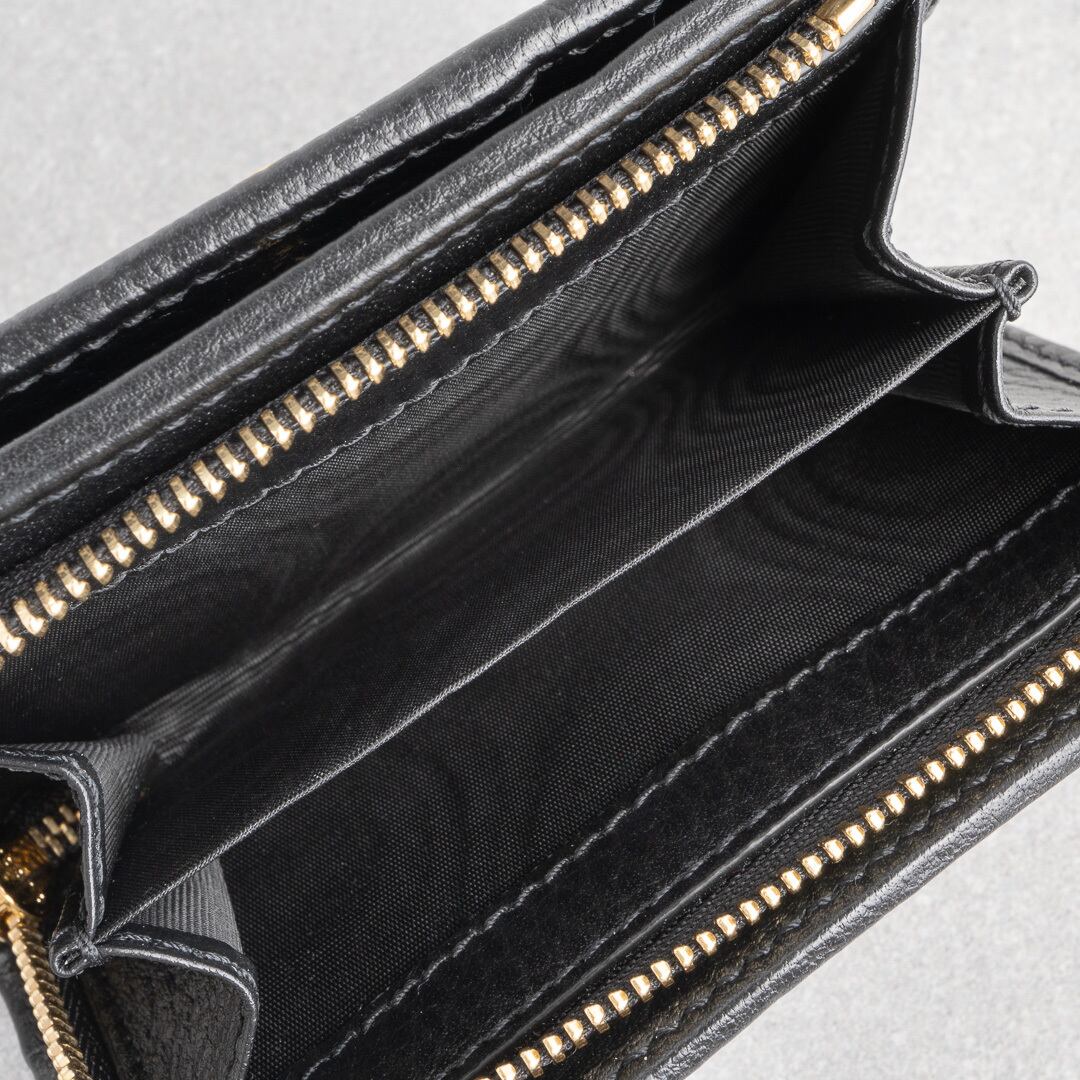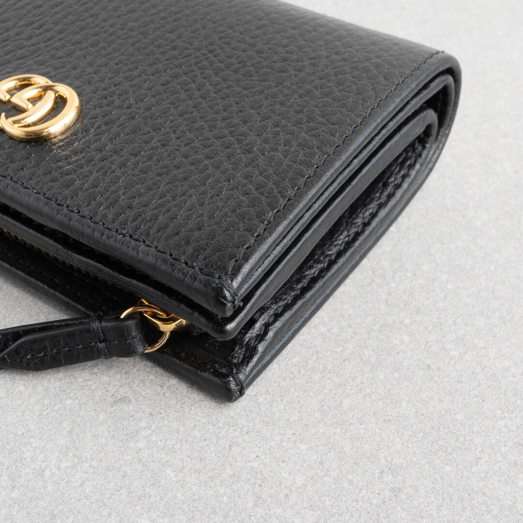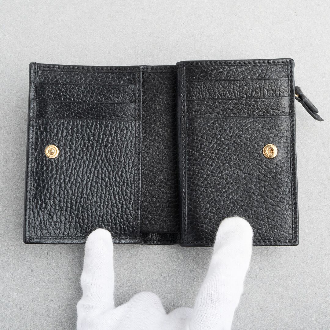 ブラックの上質なレザーにゴールドのダブルGが映える、モダンかつクラシックなデザイン。小銭入れは仕切り付きの2コンパートメント仕様で、マチもしっかりあるためたっぷり収納可能。コンパクトなサイズ感ながらカードは6枚収納可能で、デザイン性と実用性を兼ね備えたアイテムです。