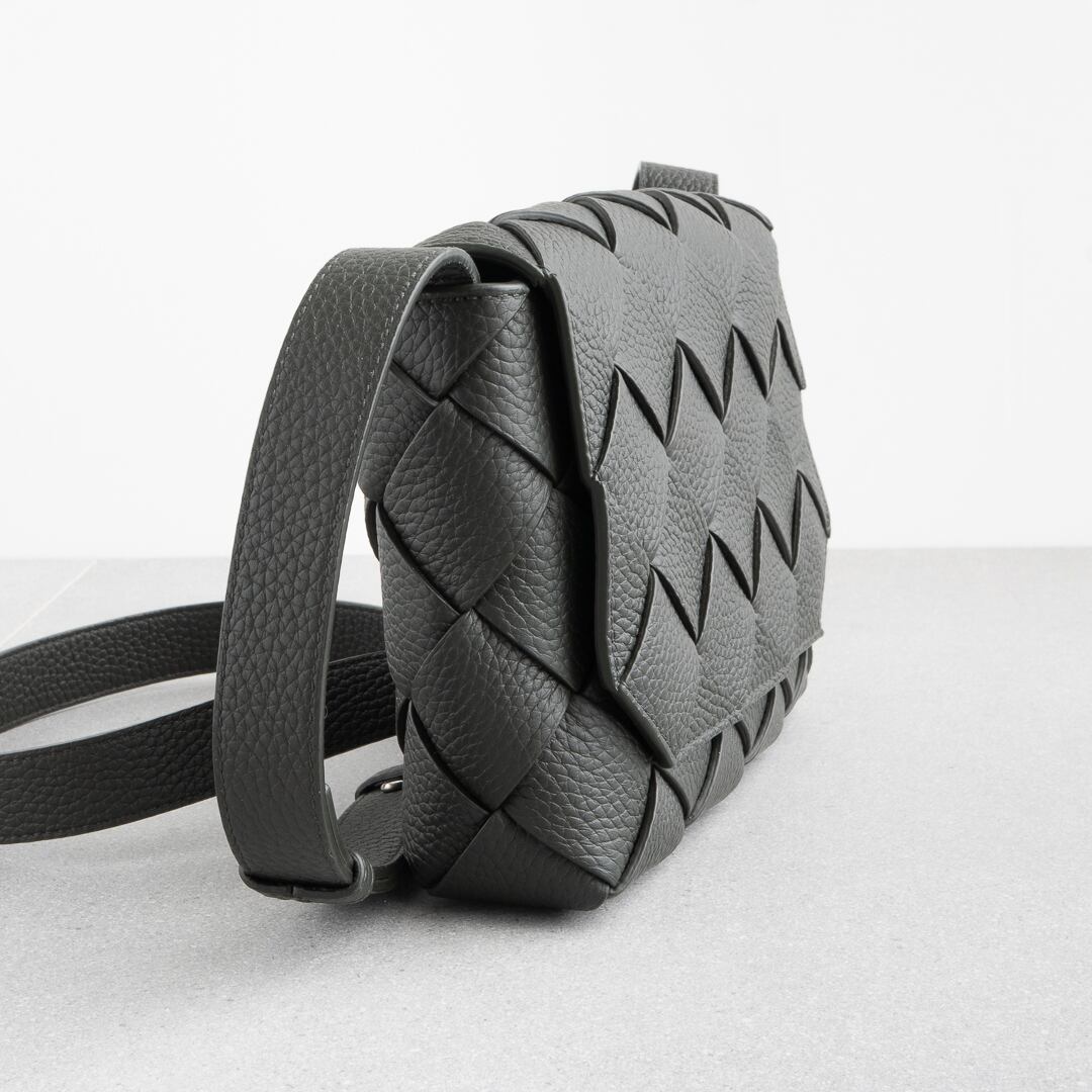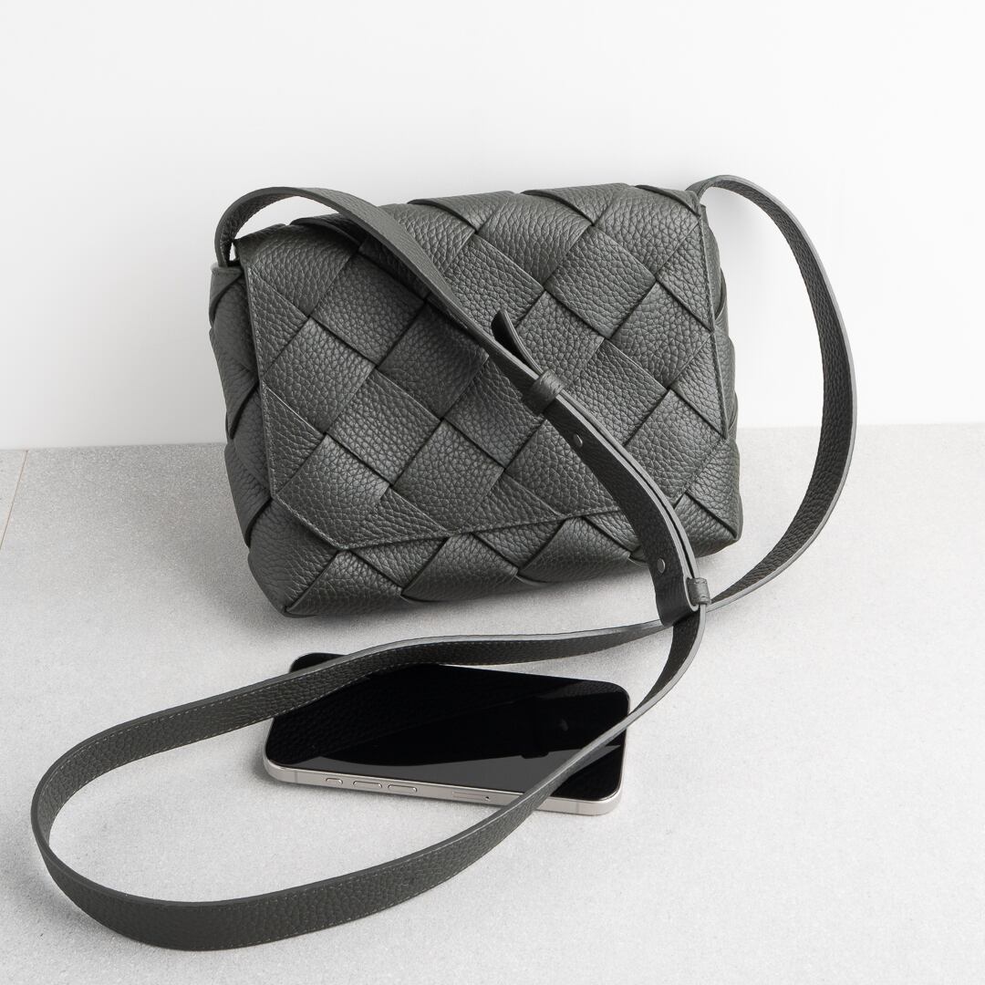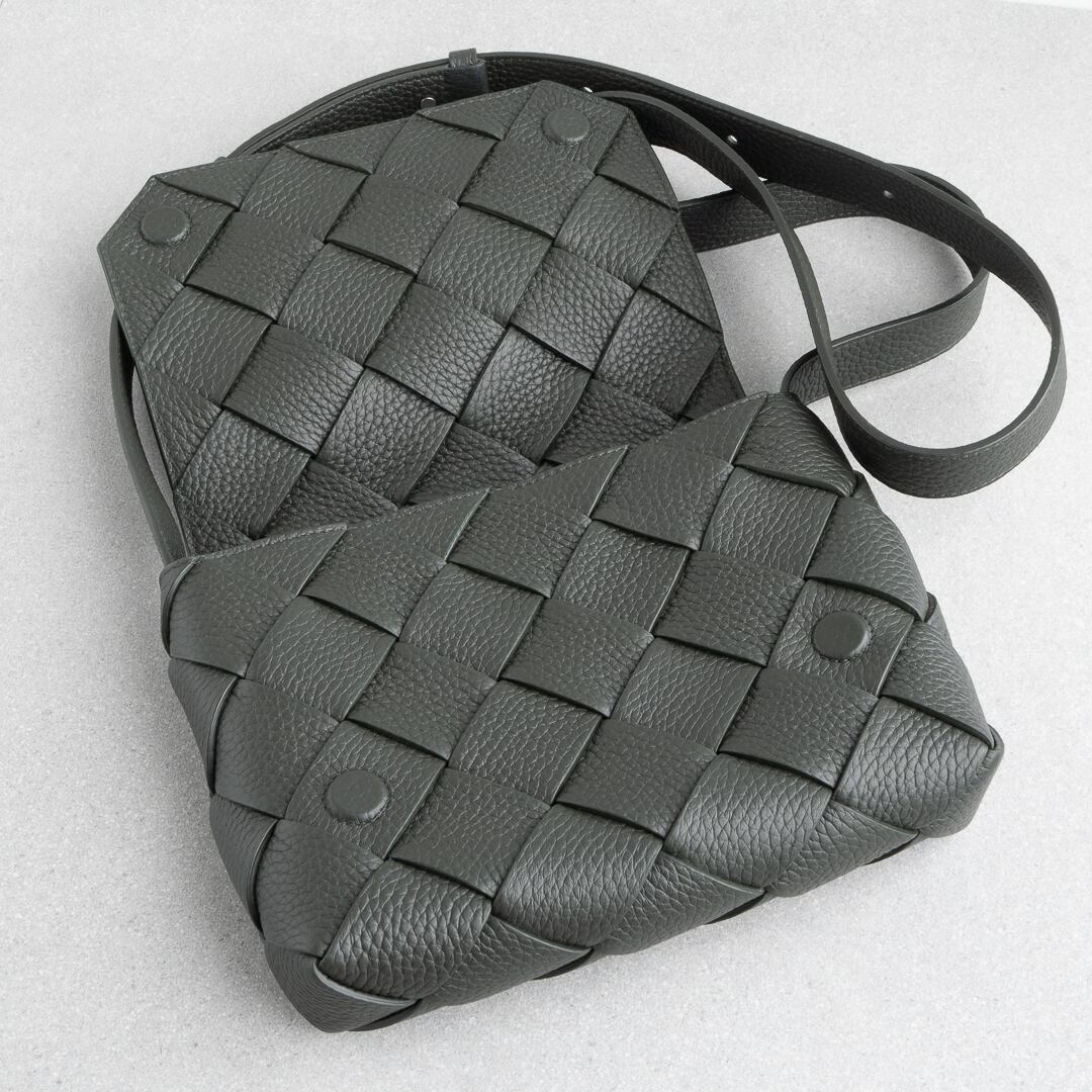 2024年に新たなラインとして登場した「ディアゴ Diago」。カセットよりも細幅でシボ感のあるしなやかなレザーを斜めに組み合わせることで、都会的で洗練された雰囲気に仕上がっています。iPhone Pro Maxや折り財布がちょうど入るサイズ感で、長財布や500mlペットボトルは収納不可。デイリーユースはもちろん、気軽なお出かけにもぴったりなバッグです。