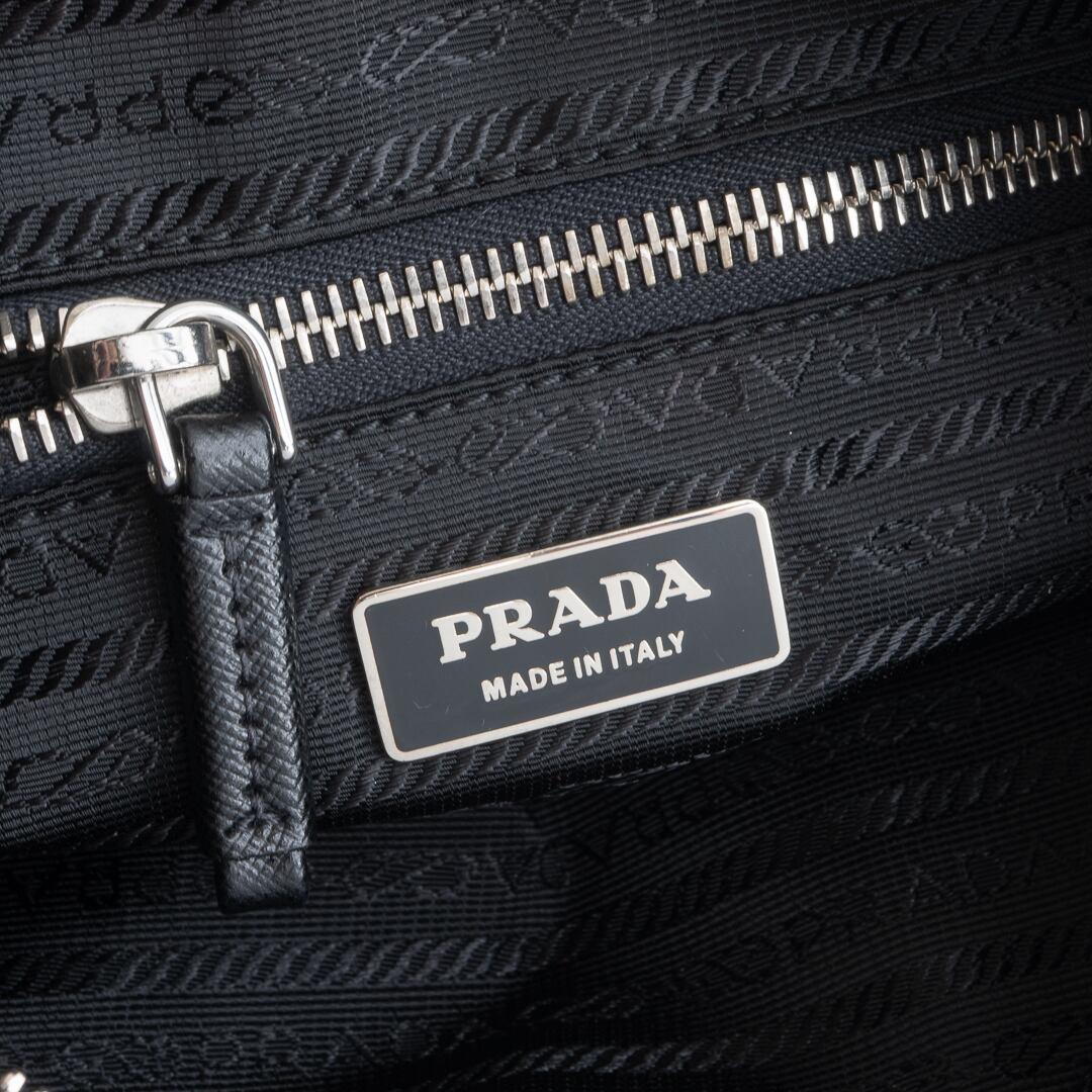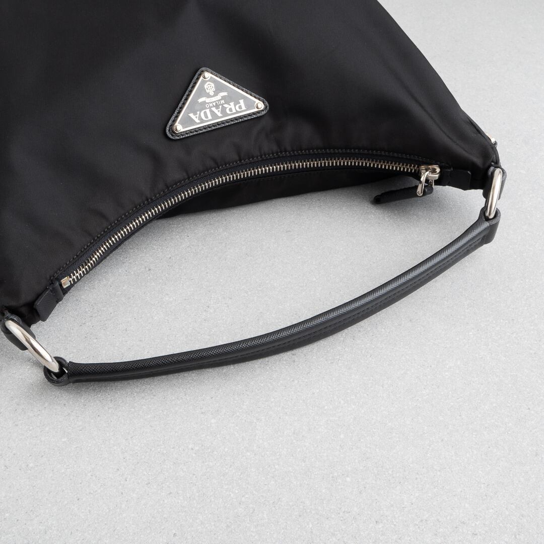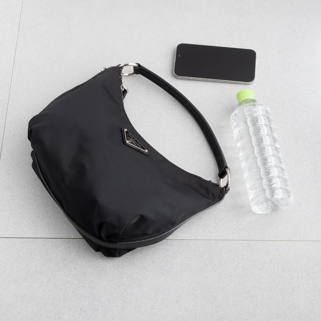 クリーンなルックスと洗練されたフォルムで、ショルダー部分はサフィアーノレザー仕様。プラダらしいミニマルなデザインに仕上がっています。スマートフォンや500mlペットボトル、長財布が収まる使いやすいサイズ感です。普段使いはもちろん、ちょっとしたお出かけにおススメなアイテムです。