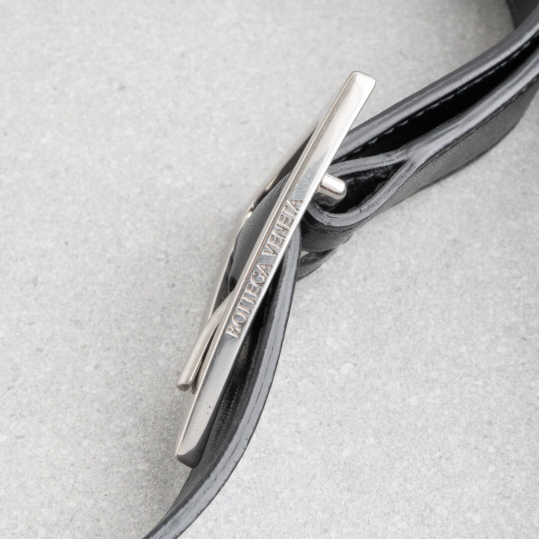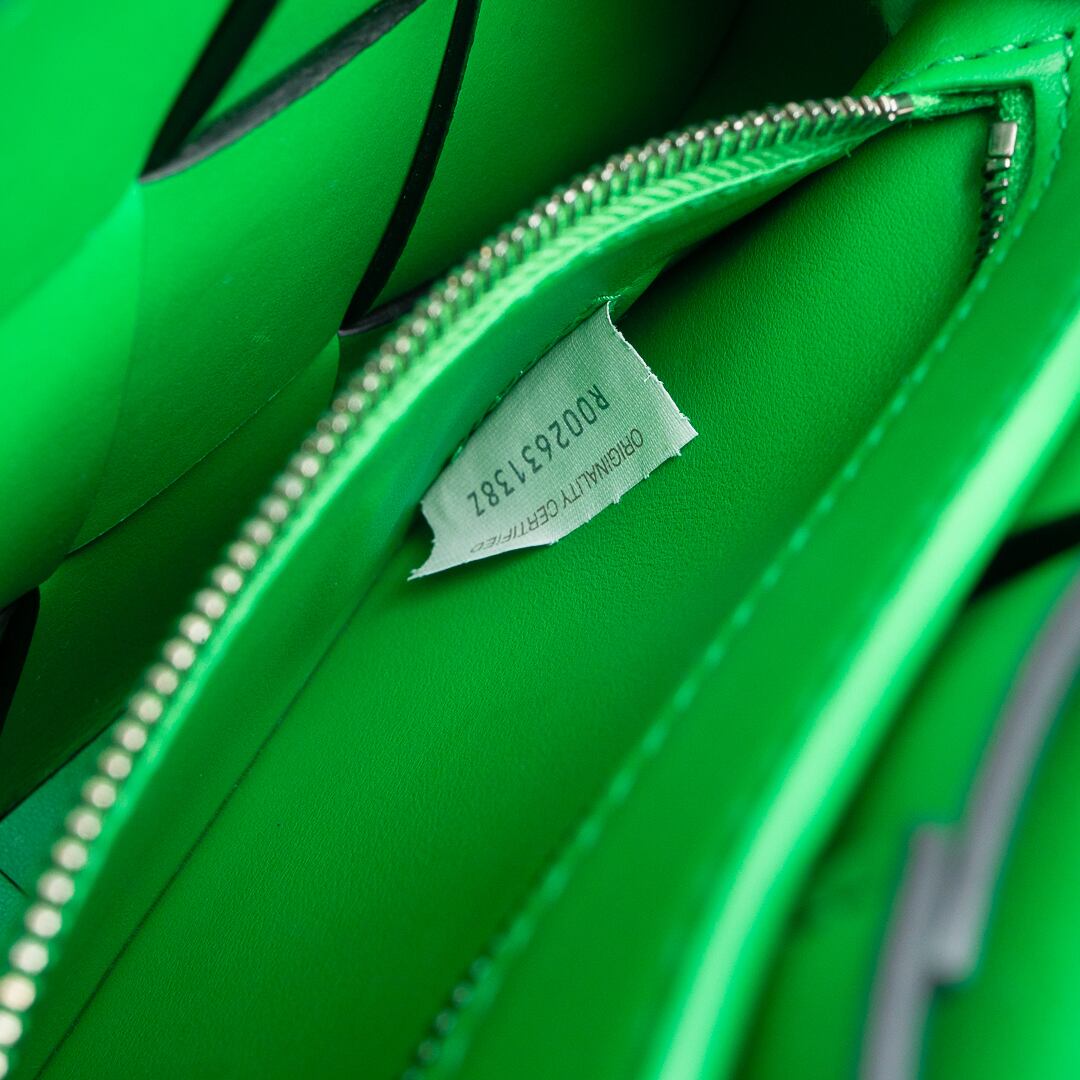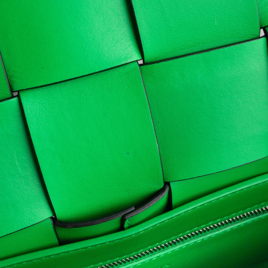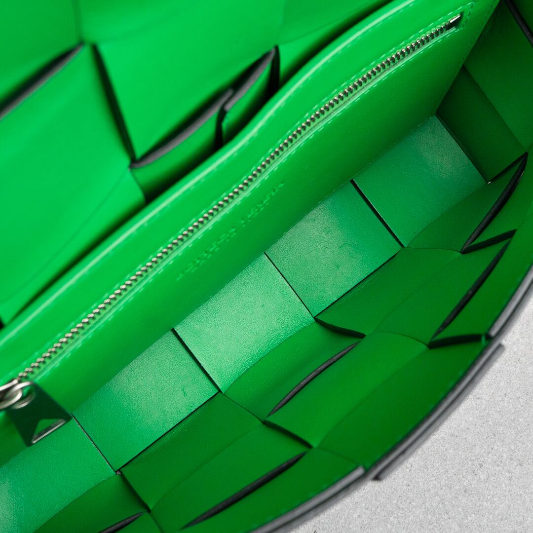 イントレチャート技法で仕上げた上質なレザーが際立つ、モダンなカセット。内側にはボッテガを象徴する鮮やかなパラキートグリーンを配し、さりげなく個性を演出します。横長のスリムなフォルムは長財布やiPhone Pro Maxをスマートに収納でき、500mlペットボトルは収納できません。日常から特別なシーンまで幅広く活躍するアイテムです。