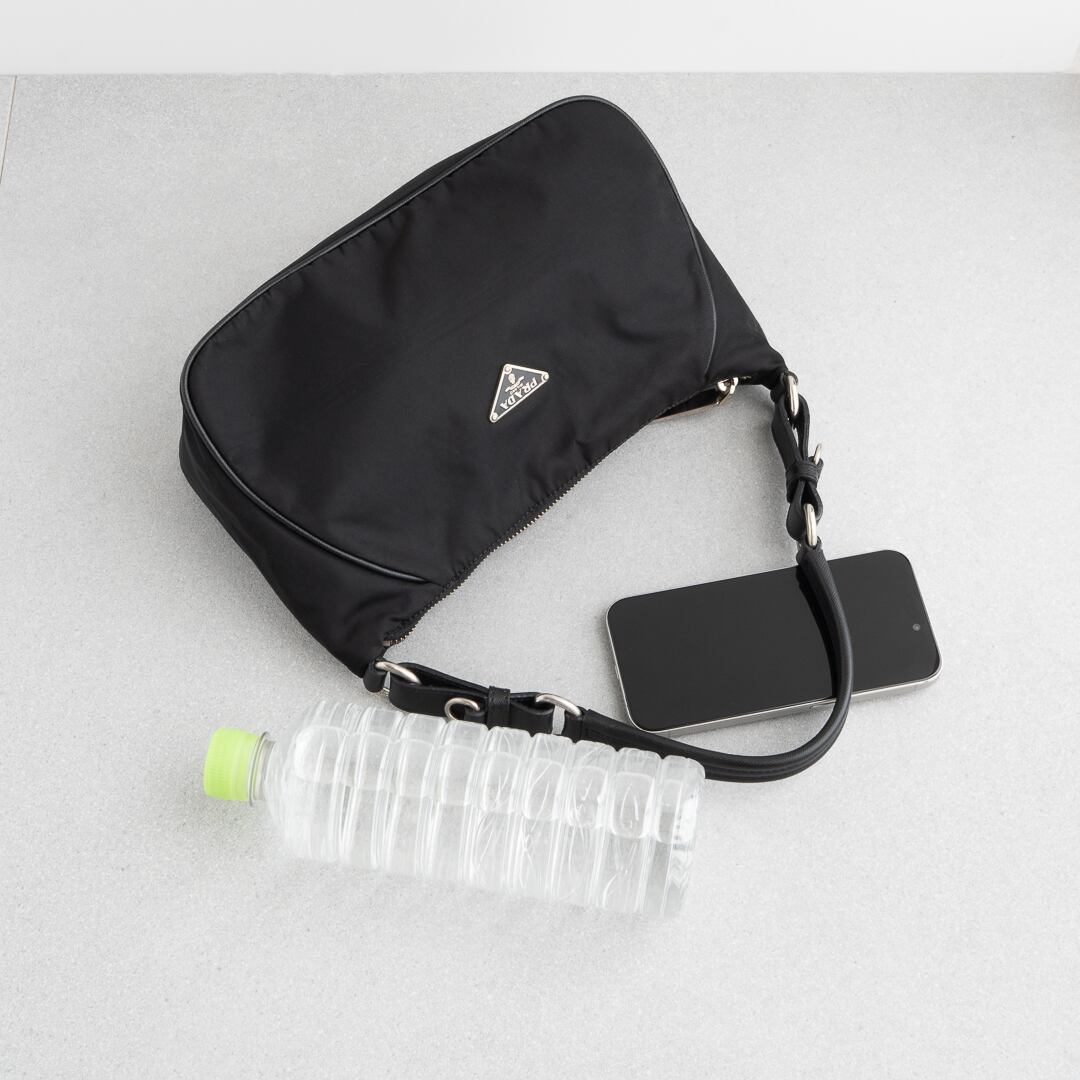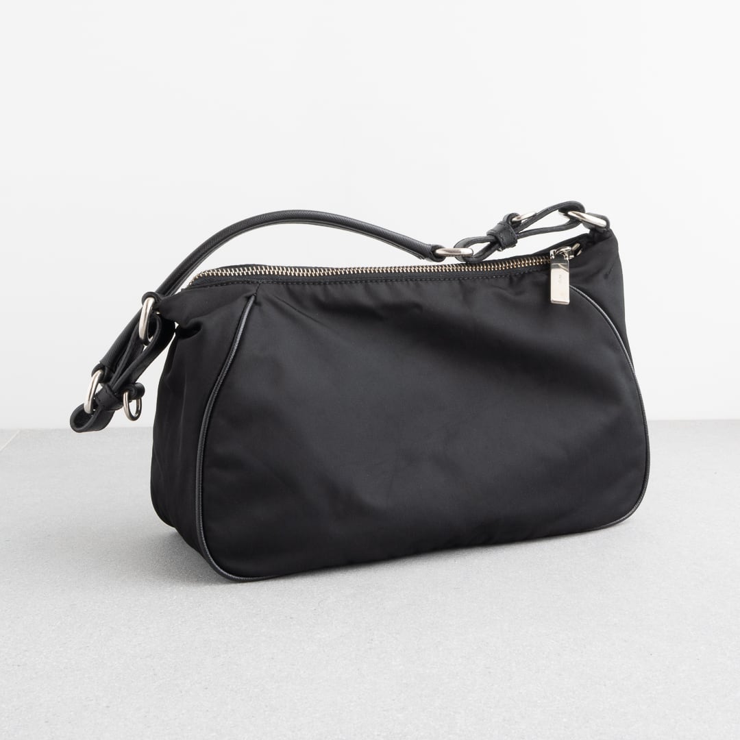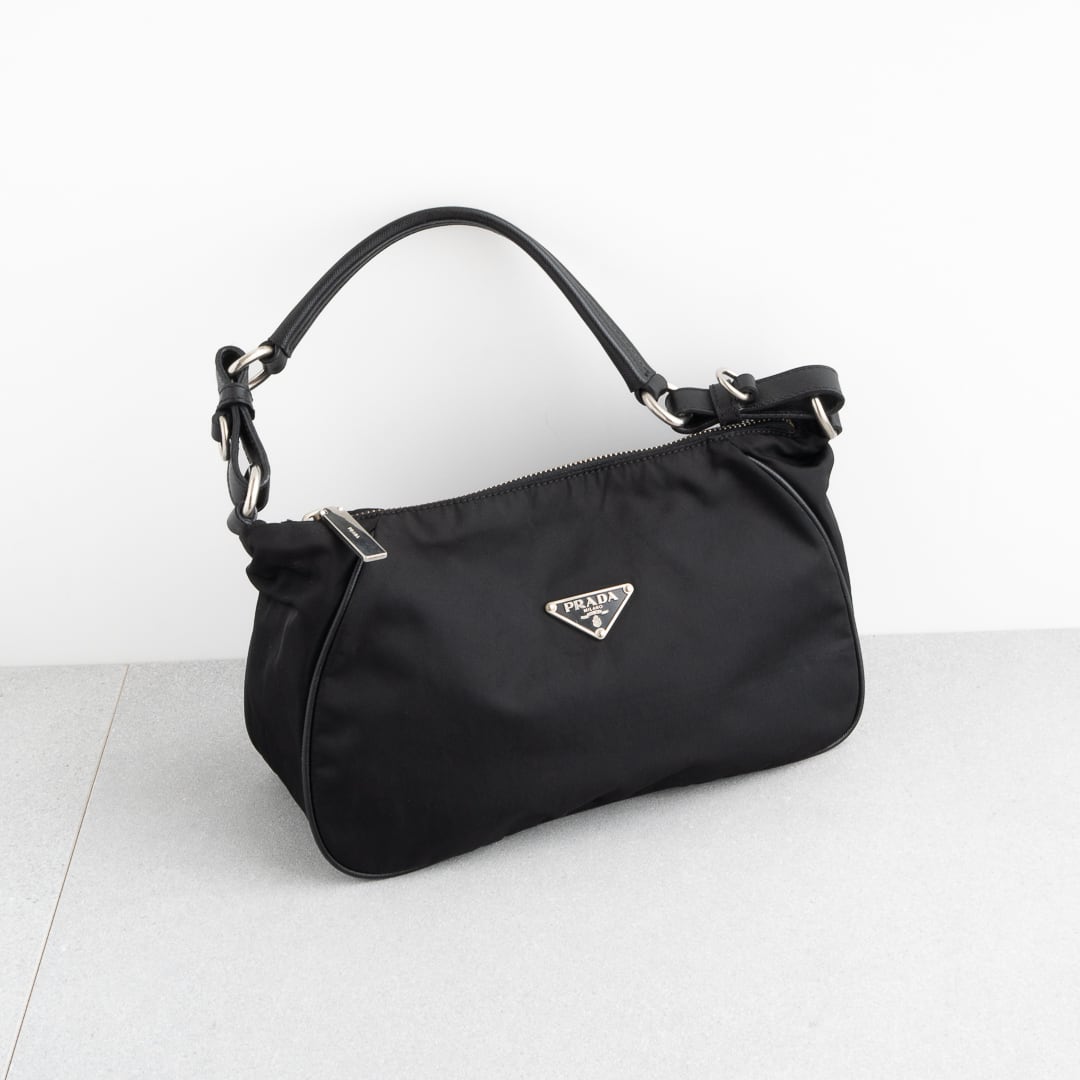 Y2Kリバイバルで再び注目を集めるプラダのワンショルダーバッグ。ブラックのナイロンとサフィアーノレザーのコンビネーションは、どんなコーデにも馴染む鉄板デザイン。ハンドルの金具がY2Kらしいアクセントになっています。スマートフォンや500mlペットボトルが収まる使いやすいサイズ感で、普段使いはもちろん、ちょっとしたお出かけにもぴったり。実用性とデザイン性を兼ね備えた万能バッグです。