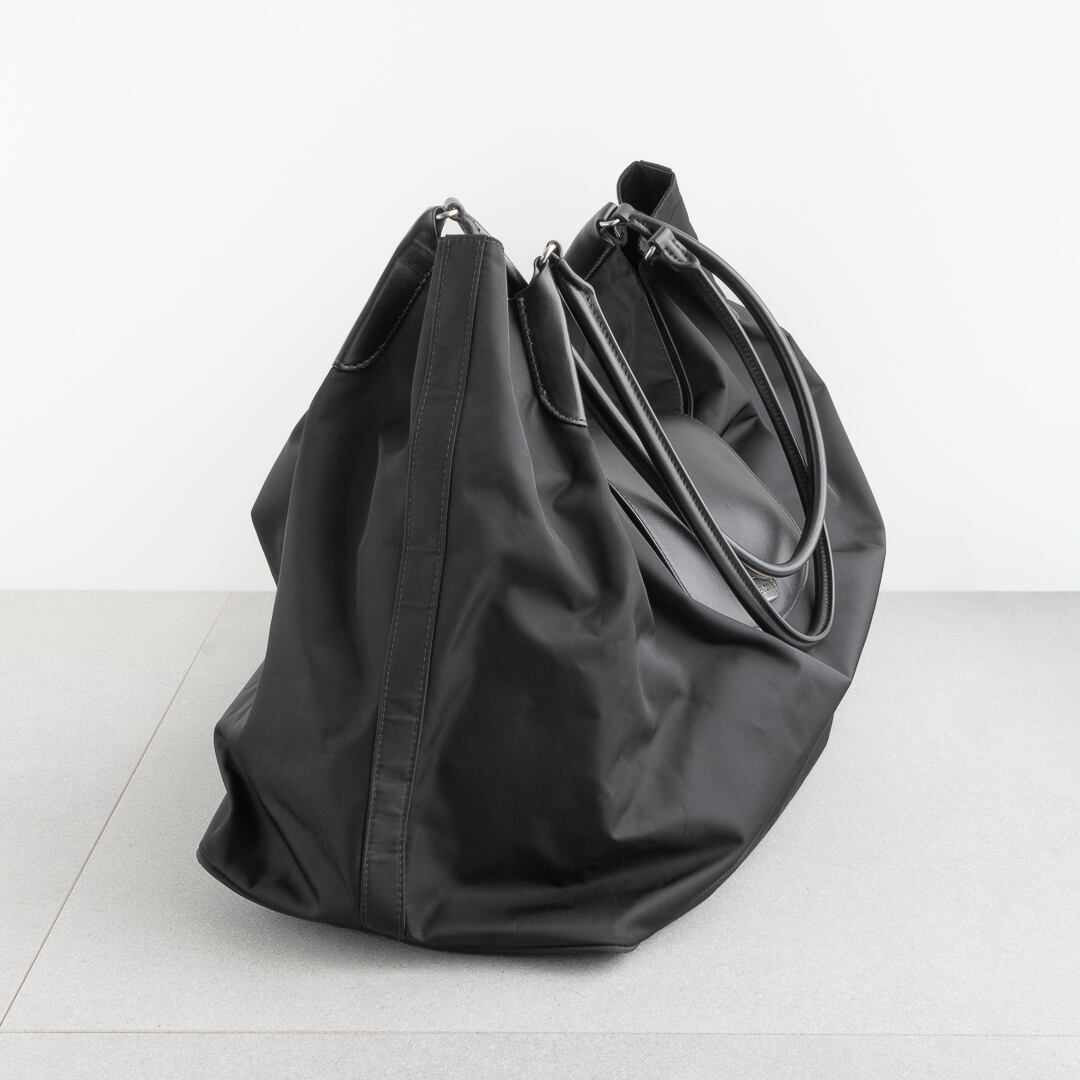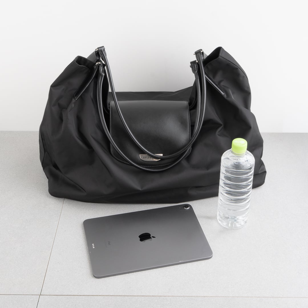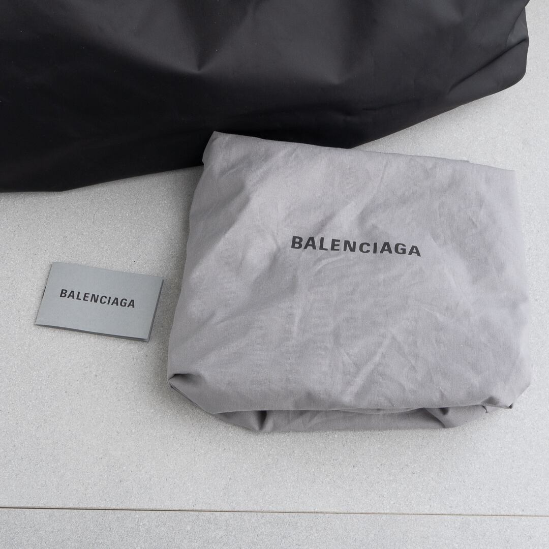 軽量で上質なナイロンに細身のレザーハンドルを組み合わせ、シンプルながらモダンな存在感を放ちます。さりげなくあしらわれたロゴもバレンシアガらしいアクセント。ゆったりとしたサイズ感でノートパソコンも楽に収まり、実用性も十分。日常使いからトラベルまで幅広いシーンで活躍してくれるバッグです。