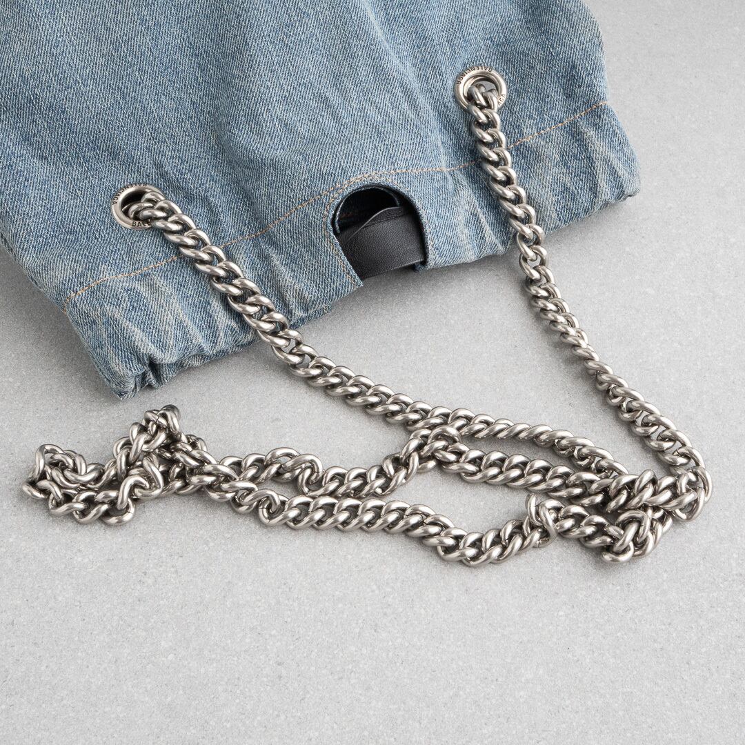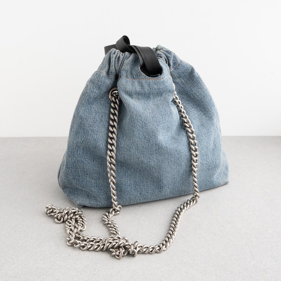 2023年春夏コレクションから登場した新作「クラッシュ トート Crush Tote」。上質な薄手のデニム生地に、チェーンがアクセントを添えるデザインです。開口部は巾着のように絞ることができ、気分やスタイルに合わせてフォルムを変えられます。コンパクトながら長財布やiPhone Pro Max、500mlペットボトルまでスマートに収納可能。デイリーユースにも、ちょっとしたお出かけにも活躍するアイテムです。