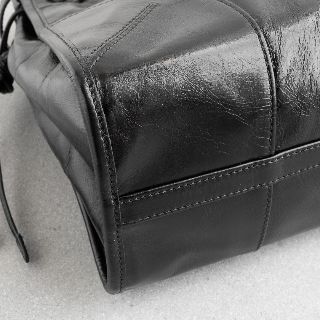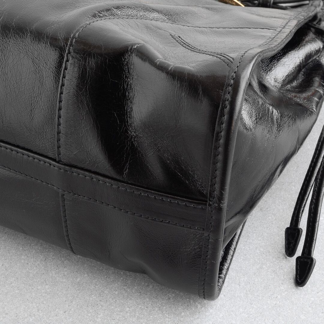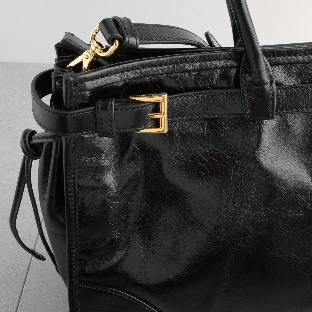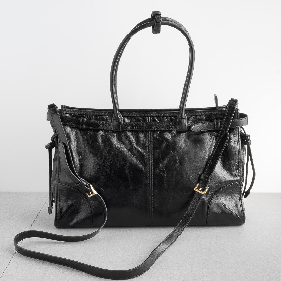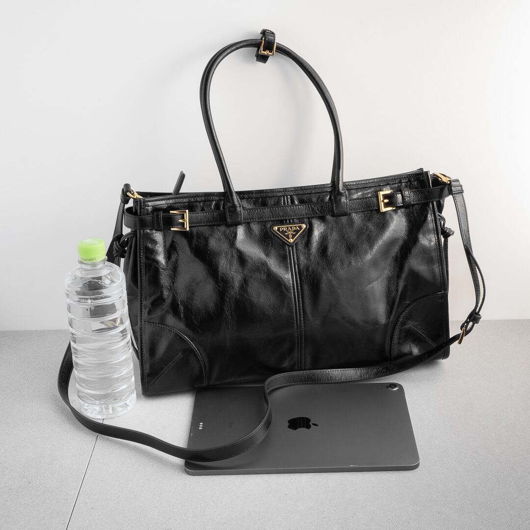 プラダの新たなアイコン「ボニー」は、光沢とシワ感のあるレザーにクラシックなベルトデザインがアクセント。Y2Kのムードをたっぷりまといながらも、どこか現代的な雰囲気を感じさせます。500mlペットボトルやiPad、13インチのノートパソコンが収まる実用的なサイズ感で、デイリーから旅行、ビジネスまで幅広く活躍するアイテムです。
