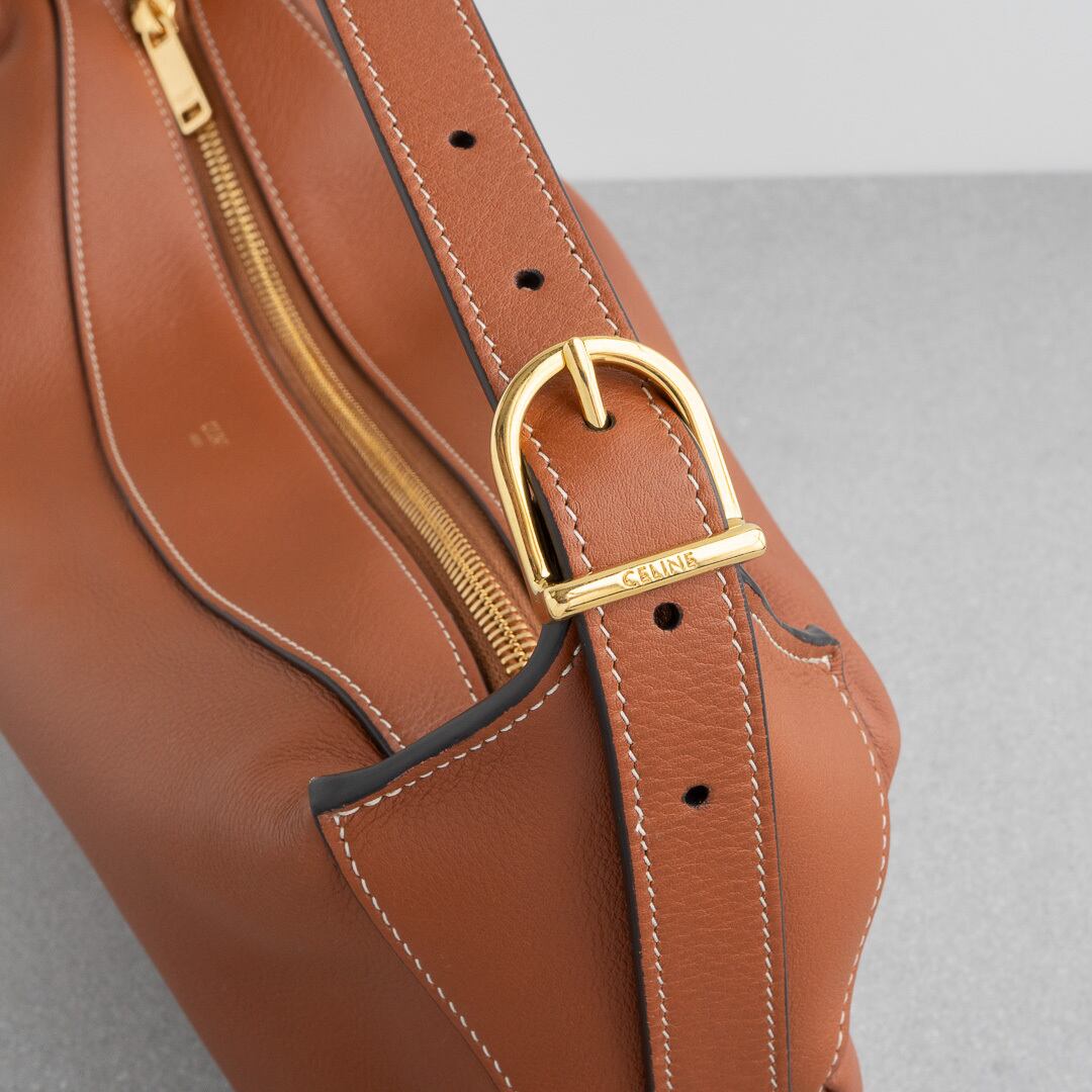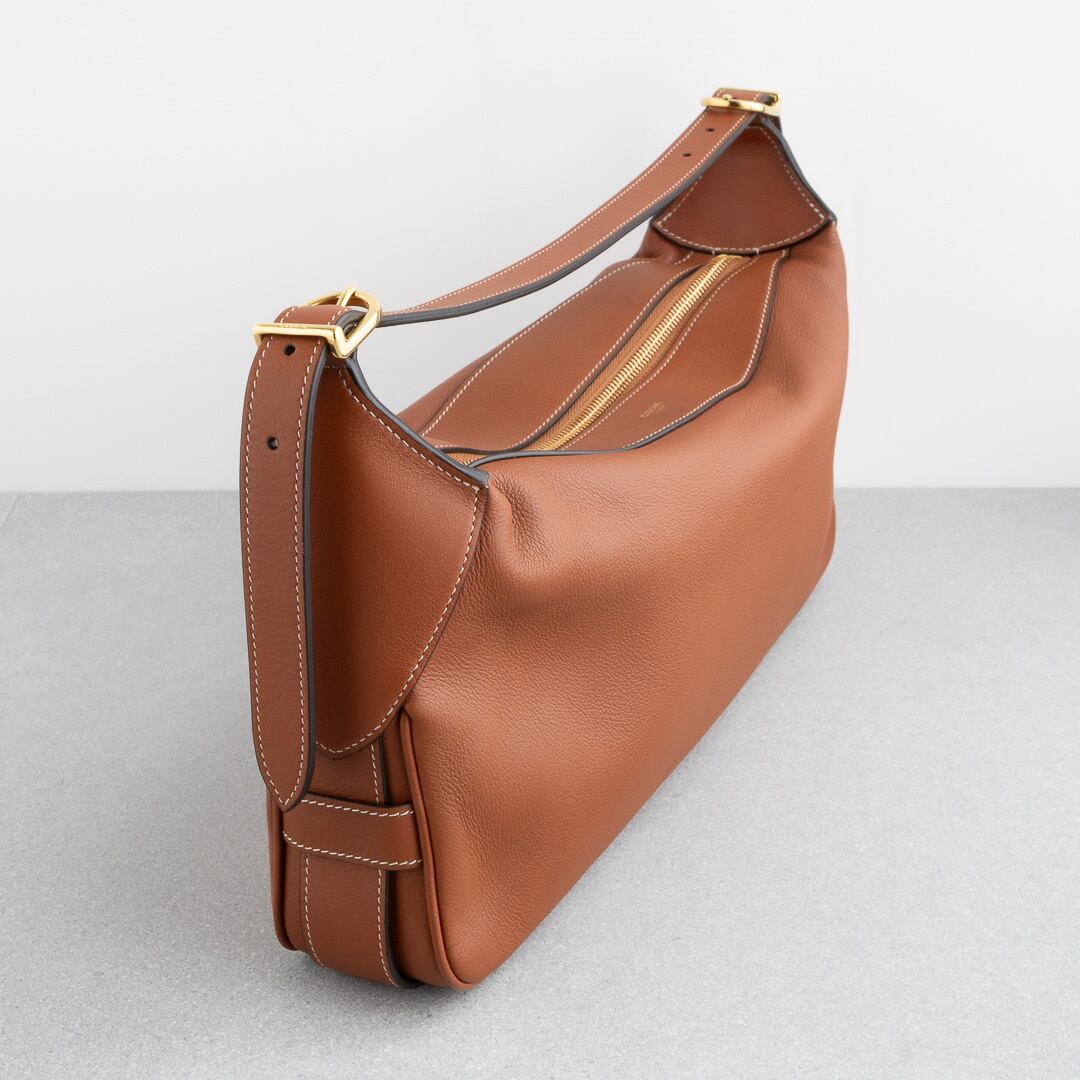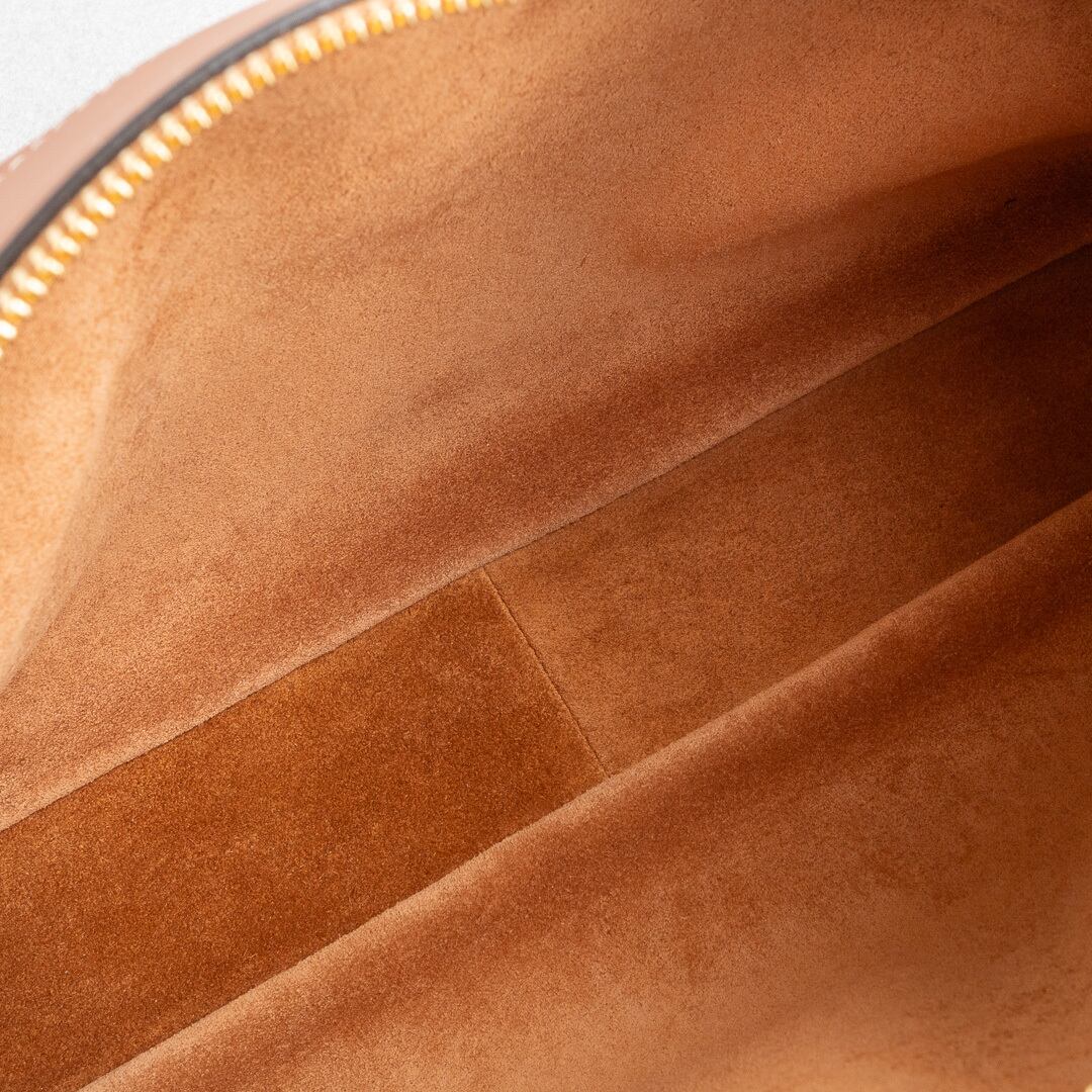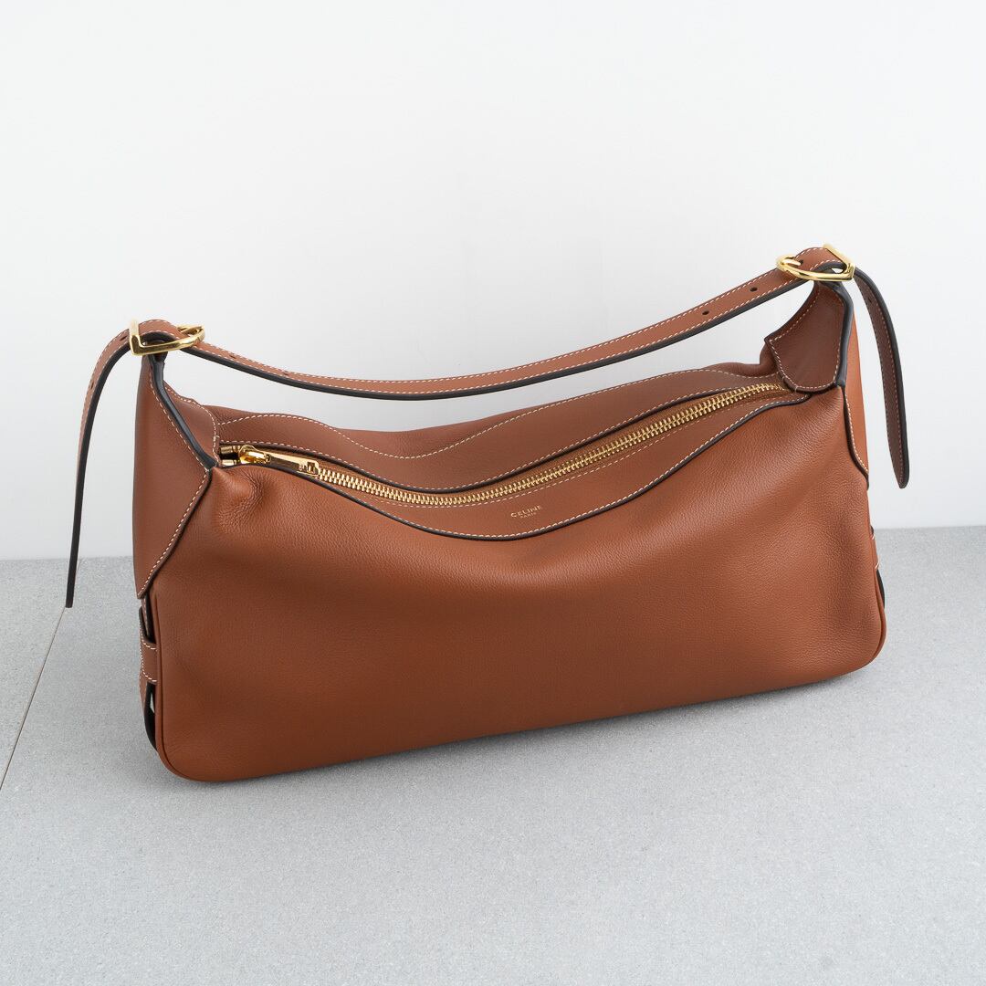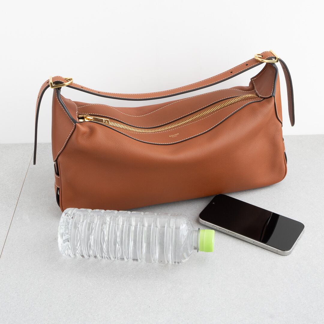21年にデビューしたロミーは上品で洗練されたホーボバッグ。しなやかな手になじむレザーと、ミニマルなデザインがセリーヌらしい上品さを感じさせます。500mlのペットボトルや長財布がすっきり収まる、普段使いにちょうどいいサイズ感で、iPadは収納できません。シーンを問わず活躍してくれるアイテムです。